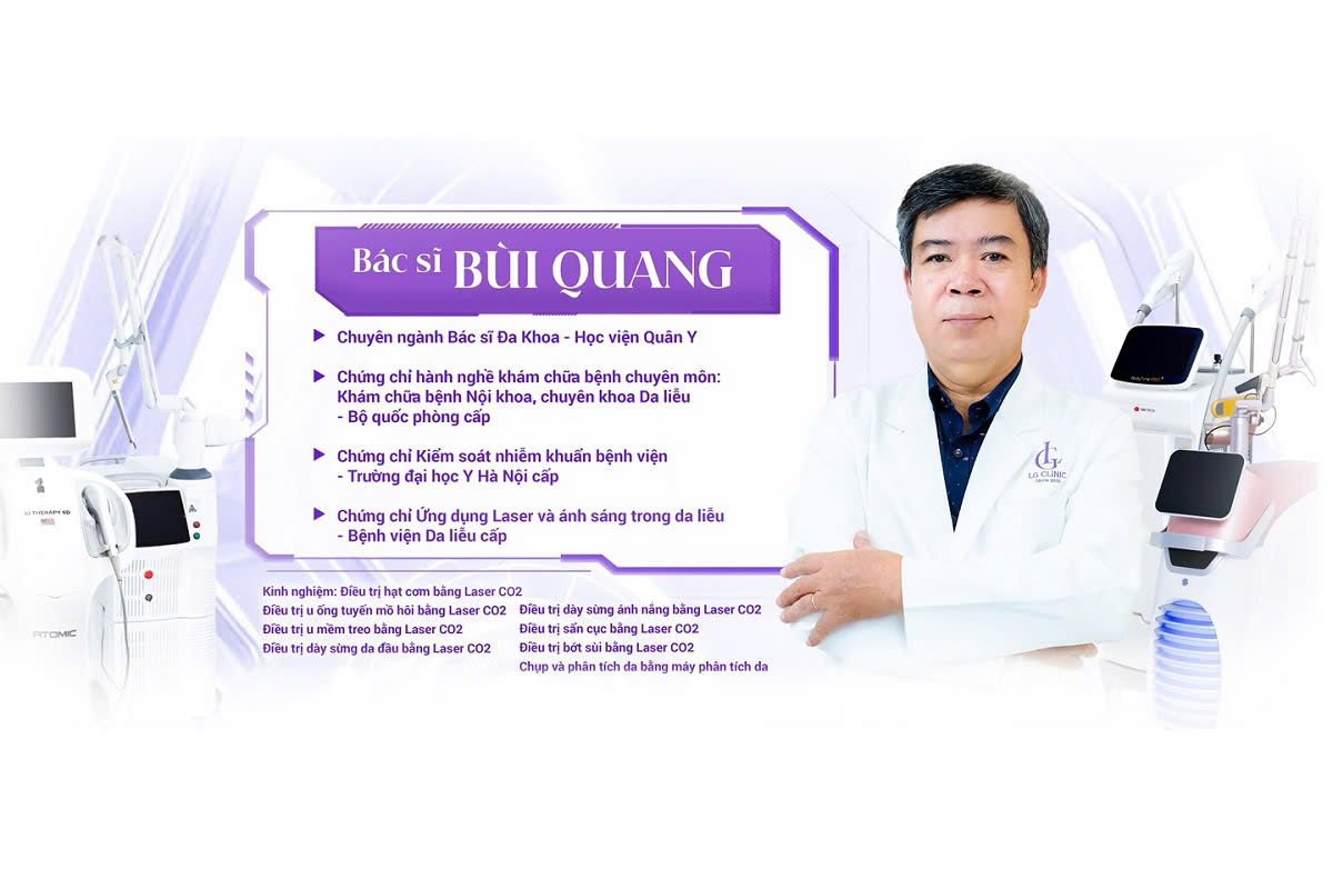 Bác sĩ Bùi Quang là một chuyên gia da liễu giàu kinh nghiệm, với nền tảng y học vững chắc được đào tạo bài bản tại Học viện Quân Y. Hơn 20 năm gắn bó với lĩnh vực y khoa và da liễu, bác sĩ Quang đã nâng cao chuyên môn và hoàn thành nhiều chứng chỉ uy tín như: Chứng chỉ hành nghề khám chữa bệnh chuyên môn, Chứng chỉ kiểm soát nhiễm khuẩn bệnh viện, Chứng chỉ ứng dụng Laser và ánh sáng trong da liễu, cùng nhiều thành tựu khác. Bác Quang hiện đang công tác tại Viện Thẩm Mỹ LG Clinic