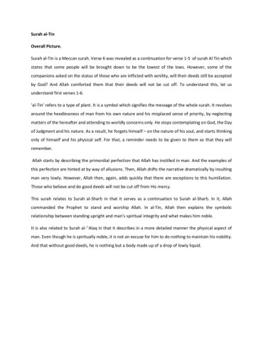 Surah al-Tin Overall Picture. Surah al-Tin is a Meccan surah. Verse 6 was revealed as a continuation for verse 1-5 of surah Al Tin which states that some people will be brought down to be the lowest of the lows. However, some of the companions asked on the status of those who are inflicted with senility, will their deeds still be accepted by God? And Allah comforted them that their deeds will not be cut off. To understand this, let us understand first verses 1-6. ‘al-Tin’ refers to a type of plant. It is a symbol which signifies the message of the whole surah. It revolves around the heedlessness of man from his own nature and his misplaced sense of priority, by neglecting matters of the hereafter and attending to worldly concerns only. He stops contemplating on God, the Day of Judgment and his nature. As a result, he forgets himself – on the nature of his soul, and starts thinking only of himself and his physical self. For that, a reminder needs to be given to them so that they will remember. Allah starts by describing the primordial perfection that Allah has instilled in man. And the examples of this perfection are hinted at by way of allusions. Then, Allah shifts the narrative dramatically by insulting man very lowly. However, Allah then, again, adds quickly that there are exceptions to this humiliation. Those who believe and do good deeds will not be cut off from His mercy. This surah relates to Surah al-Sharḥ in that it serves as a continuation to Surah al-Sharḥ. In it, Allah commanded the Prophet to stand and worship Allah. In al-Tin, Allah then explains the symbolic relationship between standing upright and man’s spiritual integrity and what makes him noble. It is also related to Surah al-‘ʿAlaq in that it describes in a more detailed manner the physical aspect of man. Even though he is spiritually noble, it is not an excuse for him to do nothing to maintain his nobility. And that without good deeds, he is nothing but a body made up of a drop of lowly liquid.