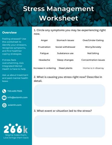 Description: Feeling stressed? Use this worksheet to identify your stressors, recognize symptoms, and find healthier coping strategies. If stress feels overwhelming, Axis Integrated Mental Health is here to help—call us at 720.400.7025 or visit axismh.com for expert support!